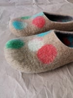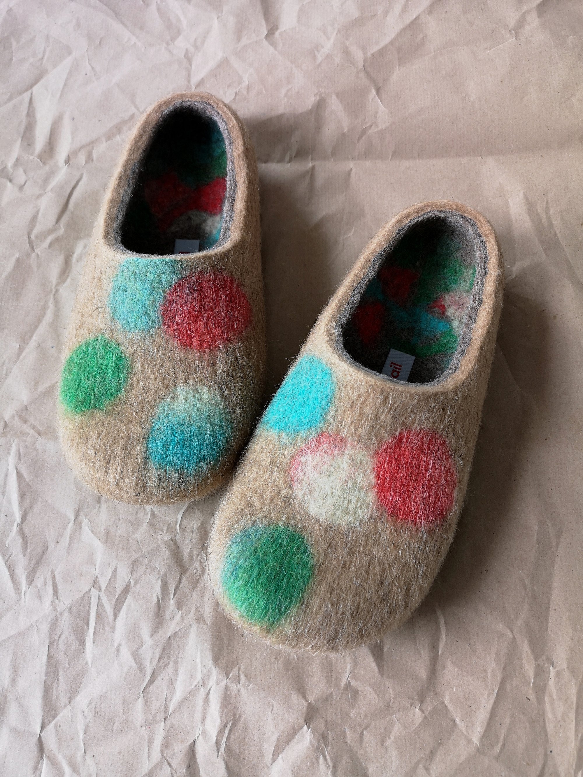 The Spot On slippers feature a unique spotted design made from leftover wool fibbers, which means the pattern and colours will vary from pair to pair. That’s the beauty of it, each one is truly one of a kind. Please allow me a bit of artistic freedom when creating your slippers, so they can be personal, playful, and made just for you.
